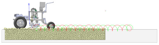It is necessary to conduct separate studies on the mechanism of intercropping between maize seeds, soil, and the cavity seeding considering the inconsistency of the particle contact models used for soils and maize seeds. Marker points were established at the two cavity seeder tips to track their motion trajectory. By measuring the course of the cavity seeder during travel, a transition section of 1200 mm was placed between the contact of the cavity seeder and the soil model. The transition section allowed comparison of the effect of the ground wheel slip on the trajectory. Figure 5 illustrates the coupling process between the cavity seeder and soil in a simulation.