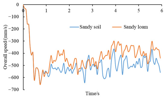 There is a difference in compressibility between the sandy soils and sandy loams studied in this paper, but they both possess a certain degree of cohesion. For sandy soils, the Hertz-Mindlin (no slip) and Linear Cohesion models were selected, and for sandy loam soils, the Hysteretic Spring and Linear Cohesion models were selected. The cavity seeder slips and sags as it travels on the soil, which affects its forward speed compensation. Figure 7 provides a comparison of the forward speed of the cavity seeder for the two soil types at 1% water content.