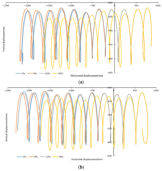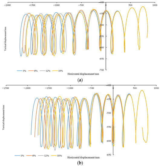 The trajectory of the cavity seeders was affected by sandy loam soil with different water contents, as shown in Figure 10a. The trajectory decreased from 1% to 18%, indicating that the slip rate of the cavity seeder increased as the water content increased. In terms of displacement in the vertical direction, the cavity seeder dropped more when the water content ranged from 6 to 18% as compared to 1%. Under all three conditions of water content, the amount of soil drop was equal. Figure 10b provides further evidence.