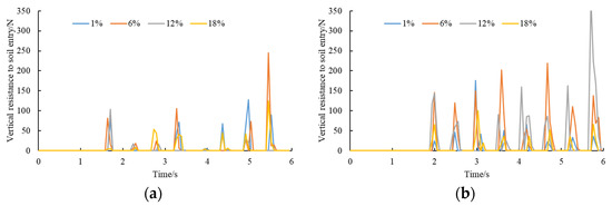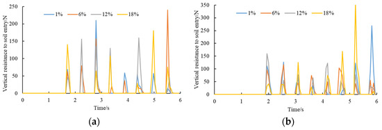 As shown in Figure 12a, the water content of sandy soil also affects the entry resistance of cavity seeders. The maximum resistance for the four water contents can be compared based on their average values. As a result, the average value was 57.99 N at 1%, 78.09 N at 6%, 84.29 N at 12%, and 78.03 N at 18%. It was found that when the water content was 1–12%, the entry resistance increased on the left side and decreased when the water content was 18%. According to Figure 12b, the average value was 88.55 N at 1%, 72.97 N at 6%, 76.39 N at 12%, and 106.90 N at 18%. It is evident that the entry resistance increased when the water content ranged from 6 to 18%. Figure 13 illustrates the resistance to cavity penetration in sandy loam soils.