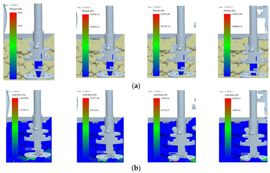 From Figure 14a, the fixed duckbill stress remains blue, but the stress is changing, transitioning from 1.11 × 105 Pa to 1.35 × 105 Pa. From Figure 14b, the axial stress of the duckbill on the soil appears red, with the soil stress at 1.39 × 105 Pa when the duckbill first enters the soil, gradually decreasing to 7.96 × 104 Pa before increasing in small floats to 9.10 × 104 Pa.