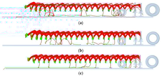 Effect of the maize shape on seeding performance. (a) Horse tooth. (b) Spherical cone. (c) Spherical. Note: the color of the maize seeds represents the movement speed, with red representing high speed, blue representing low speed, and green representing medium speed.