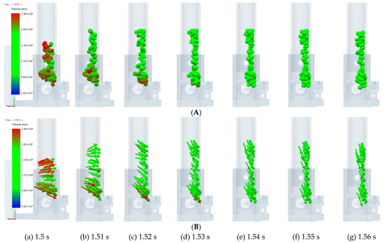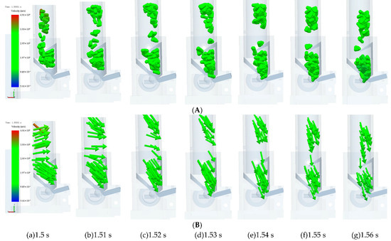 Movement process of maize in the seed tube with the added inverted hook. (A) Default display. (B) Vector display.