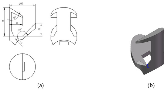 Shape and size of the inverted hook. (a) Two-dimensional view. (b) Three-dimensional view.