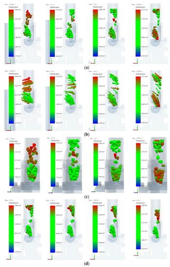 In response to the self-weight and forward speed compensation mechanism, the seed in the seed tube moves, as shown in Figure 16. Seeds remain in contact with the seed tube for too long during the filling process, resulting in a delay in the seed filling process. The maize has only 0.07 s to fill the shaped space during a cycle of 1.50 s to 1.57 s. Figure 16 illustrates the movement of horse tooth maize seeds inside a traditional structural seed tube.