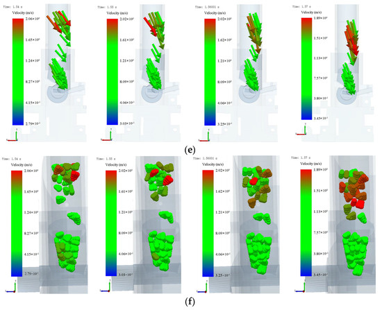 A barbed hook is used to separate the maize in the seed tube into upper and lower populations. This is shown in Figure 20. The maize model above the inverted hook moved at a faster speed and had an uneven distribution. The maize below, on the other hand, moved uniformly and moved downward under the influence of the seed guide curve. Additionally, the guiding seed’s cross-section was funnel-shaped, which enhanced the seed’s filling speed. A few maize seeds can fit into the shaped groove of the seed picking wheel.