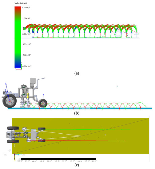 Simulation seeding performance of the cavity planter with vertical insertion. (a) Seed movement trajectory. (b) Trajectory of the cavity seeder (main view). (c) Trajectory of the cavity planter (top view).