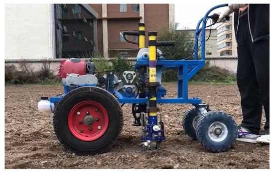 Based on simulation experiments, the single grain rate was 75%, the reseeding rate was 25%, and the missed seed rate was 0%. Additionally, a field trial was conducted at Taohe Tractor Factory, Lintao County, Gansu Province, China, on 11 March 2021. The experiment field was oriented east–west with pre-rotational plowing and leveling. It was a sandy loam soil. The soil water content ranged from 11.7% to 13.6%, and the average soil firmness measured with a TJSD-B firmness instrument at 45 mm depth was 137 kg/cm2 (Beijing Jingcheng Huatai Instrument Co., Ltd., Beijing, China). The maize material was Longdan No. 339. The mass of one thousand grains was 371 g, and the average size of the seeds was 14.2 mm by 10.8 mm by 7.3 mm. We used a self-propelled cavity planter of type 2BZ-2 with vertical insertion at a forward speed of 0.5 m/s. The prototype is illustrated in Figure 22.