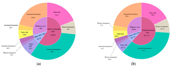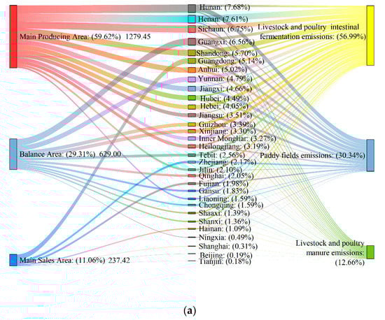 Agricultural methane emissions in the main producing area, main sales area, and balance area showed a downward trend, but the changes had their own characteristics (Figure 3). The main producing area was the region with the highest agricultural methane emissions. From 2000 to 2019, the main producing area decreased the most, from 12.79 million tons to 10.84 million tons. From the perspective of the planting industry, the sown area of double-cropping early rice and double-cropping late rice in the main producing areas decreased by 27.61% and 31.83%, respectively, but the sown area of single-crop rice increased by 48.38%, which led to an increase in methane emissions from paddy fields in the main producing areas. From the perspective of the breeding industry, although the methane emissions from paddy fields in the main producing areas increased to a certain extent, an increase of 14.36%, the methane emissions from livestock and poultry manure management and enteric fermentation decreased by 507,500 tons and 2,028,000 tons, respectively. From 2000 to 2019, the number of livestock and poultry breeding dropped significantly, and the number of non-dairy cows, goats, pigs, poultry, horses, camels, and donkeys decreased by 43.83%, 20.43%, 29.04%, 16.78%, 62.97%, 88.65%, and 70.96%, respectively. The number of poultry breeding fell the most. The main production areas bear the heavy responsibility of China’s food security, and the decline in emissions shows that the industrial structure has been improved, to a certain extent, and agricultural green production has gradually improved. From the perspective of planting industry, the sown area of double-cropping early rice and double-cropping late rice in the main producing areas decreased by 27.61% and 31.83%, respectively, but the sown area of single-crop rice increased by 48.38%, which led to an increase in methane emissions from paddy fields in the main producing areas. From the perspective of the breeding industry, although the methane emissions from paddy fields in the main producing areas increased to a certain extent, with an increase of 14.36%, the methane emissions from livestock and poultry manure management and enteric fermentation decreased by 507,500 tons and 2,028,000 tons, respectively. From 2000 to 2019, the number of livestock and poultry breeding dropped significantly, and the number of non-dairy cows, goats, pigs, poultry, horses, camels, and donkeys decreased by 43.83%, 20.43%, 29.04%, 16.78%, 62.97%, 88.65%, and 70.96%, respectively, and the number of poultry breeding fell the most. The main production areas bear the heavy responsibility of China’s food security, and the decline in emissions has shown the improved industrial structure and increased agricultural green production. Methane emissions in the balance area fell from 6.29 million tons to 5.60 million tons. In the balance area, methane emissions from rice fields, livestock manure management, and livestock intestinal fermentation all decreased by 23,600 tons, 169,800 tons and 285,400 tons, respectively. The balance area is located mainly in Central and Western China, and the change in emissions was partly due to the implementation of China’s western development strategy. In addition, methane emissions in the main sales area dropped from 2.37 million tons to 1.25 million tons, decreasing by 47.48%. The methane emissions from paddy fields, livestock manure management, and livestock enteric fermentation in the main sales area decreased by 41%, 48.14%, and 61.25%, respectively. Except for dairy cows, the number of livestock and poultry has decreased significantly. This was mainly due to the fact that the main sales areas, such as Beijing, Tianjin, and Shanghai, are relatively developed areas in China. With limited land and other planting resources and a large food shortage, it is necessary for these developed areas to rely on other provinces to transport food, forcing the region to adjust the industrial structure and objectively promoting the reduction of agricultural methane emissions. The decline in methane emissions in main producing and sales regions was the main reason for the overall decline. Therefore, the main producing areas have high methane emissions and are key areas for the green transformation and development of agriculture.