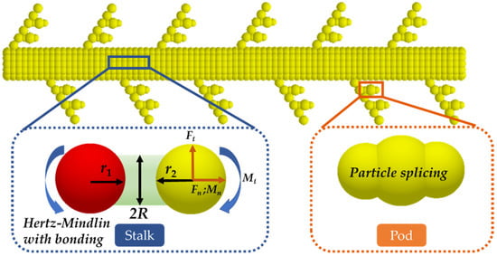 When the parameters of the bonding bonds between the particles reach the critical value, all the links between the particles disappear so that the particles will recover the discrete characteristics. The critical importance of the bonding bonds is shown in Equations (5) and (6) [28,29]. The characteristic parameters of the particle stalks and bond bonds are shown in Table 1 and Table 2, and the simulation model of the oilseed rape plant is shown in Figure 2.