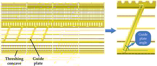 Considering the size of the feeding volume, size of oilseed rape seeds, and other parameters, the length of the sieve holes of the concave plate is 35 mm and the width is 15 mm, and each concave plate sieve is distributed with 360 holes. In addition, the first two groups of concave plate sieves are installed with angle-adjustable deflector plates, as shown in Figure 4.