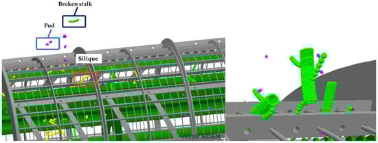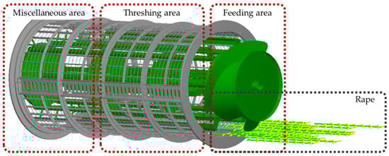 The oilseed rape threshing process feeds multiple bunches of oilseed rape plants into the threshing device, as shown in Figure 5. The feeding area is used to feed oilseed rape plants, the threshing area is used to thresh, and the miscellaneous area is where impurities such as hulls and broken stalks are discharged out of the device. We set the feeding speed to 7.5 km/h, removing the limit constraint effect on the particles when the bonding bond is generated, and adding the global gravitational acceleration to 9.8 N/kg. After the oilseed rape plant is fed into the threshing device, it first enters the threshing zone, where the oilseed rape seeds fall off the spike shaft and become discrete particles under the action of the threshing ribs and concave plates [14]. The threshed seeds fall into the catch box under inertia. The operating environment of the threshing simulation is shown in Table 4.