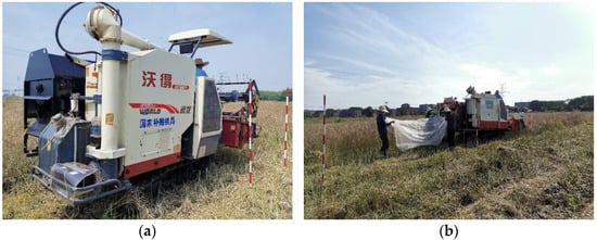 The oilseed rape harvesting field test was conducted in Liyang City, Jiangsu Province, from 6–8 June 2022. The test scheme is shown in Table 5. In this test, the threshing cylinder speed, concave plate speed, and guide plate angle are independent variables, and threshing loss rate and grain breakage rate are evaluation indexes. The oilseed rape harvest field test is carried out according to “GB/T8097-2008 Test Method of Harvesting Machinery Combine Harvester” and “NY/T1231-2006 Technical Specification for Quality Evaluation of Oilseed rape Combine Harvester”, as shown in Figure 6.