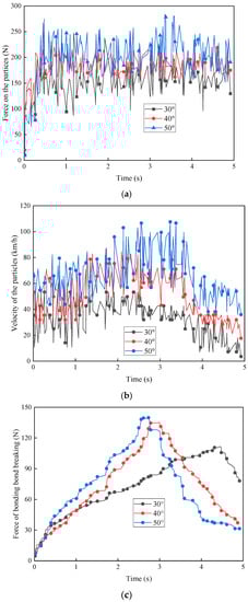 Influence of different guide plate angle on the particles. (a) Force curves of particles. (b) Velocity curves of particles. (c) Breaking force curves of the seed-stalk bonding bond.
