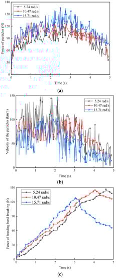 Variation of kinematic characteristics of particles with time in different concave plate speed. (a) Force curves of particles. (b) Velocity curves of particles. (c) Breaking force curves of the seed-stalk bonding bond.