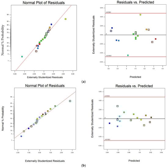 Lack of fit is the expression of a poor model, and the lack of fit test is to check whether the measurement model lacks fit. If the p-value of the lack of fit is greater than 0.05, this indicates that the lack of fit is not significant. Overwise, it suggests that the model is poor and cannot be used to analyze the data. The lack of fit terms of the two regression models is 0.0804 and 0.3642, which are greater than 0.05, indicate that no other factors in the model impacted the value of the threshing loss rate and grain breakage rate. The standard residual error of the regression is analyzed by Design Expert software, which satisfies the hypothesis of normality and normal distribution, and the variance is equal, indicating that the model is stable and effective, as shown in Figure 11a,b.