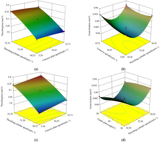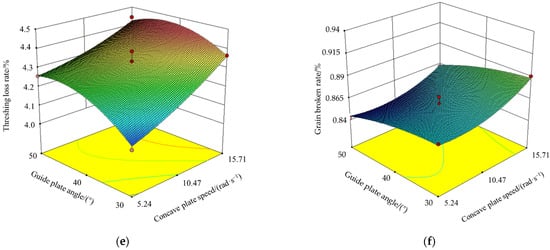 As shown in Figure 12e,f, the interaction of guide plate angle and concave plate speed has no significant effect on the threshing loss rate and grain breakage rate. With the increase of concave plate speed and guide plate angle, the threshing loss rate and grain breakage rate show an overall trend of gradual increase, indicating that the greater concave speed and guide plate angle are not conducive to the oilseed rape threshing operation. In a research study by Fan et al. [39], the function of the guide plate is to prevent grains from staying and accumulating in the threshing device to avoid blockage. Generally, the guide plate angle for corn ears is about 35°, which is determined by the fact that corn ears have many bracts. A larger guide plate angle will shorten the threshing process. However, for oilseed rape threshing, the grain size is smaller than that of corn ears, so, understandably, there is a gap between this result and the literature.