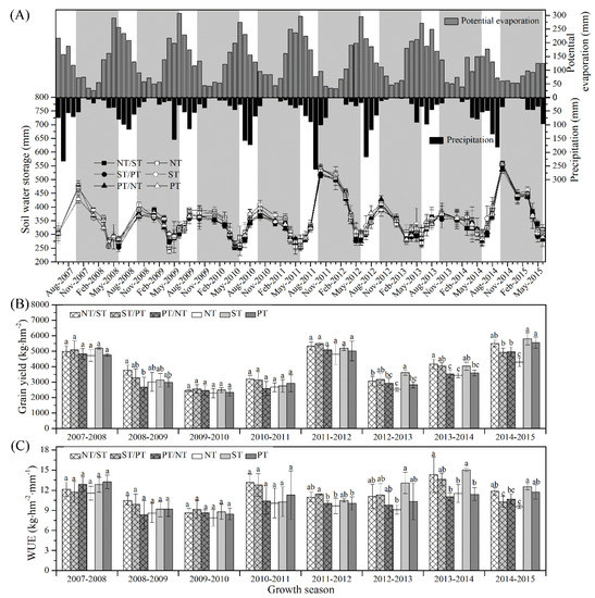 - He, G.; Wang, Z.; Li, F.; Dai, J.; Li, Q.; Xue, C.; Cao, H.; Wang, S.; Malhi, S.S. Soil water storage and winter wheat productivity affected by soil surface management and precipitation in dryland of the Loess Plateau, China. Agric. Water Manag. 2016, 171, 1–9. [Google Scholar] [CrossRef]