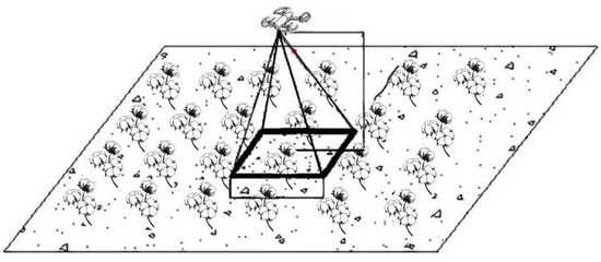 The test site was located in No. 3 Farm, Alar City, Xinjiang, China (40.541914° N, 81.285884° E). The cotton variety was Tahe No. 2, which was sown on April 25 and sprayed with defoliant on 5 September. The defoliant type was detalon 300 g/hm2 + 40% ethephon 1200 mL/hm2. The image acquisition time was from 15 September 2021 to 2 October 2021. This period was the most significant period for cotton defoliant and boll opening after spraying the defoliant. The image acquisition equipment was DJI Mavic AIR 2 four-axis UAV. The main parameters of the aircraft were the weight of 0.57 Kg, the maximum ascending speed of 14.4 Km/h, the maximum descending speed of 10.8 Km/h, the flying speed of 68.4 Km/h, the maximum flying time of 34 min, and the endurance mileage of 18.5 Km. The built-in camera had a wide-angle fixed focus lens, a coverage angle of 84 degrees, a sensor model of 1/2 inch CMOS, an effective pixel of 12 million, and a maximum photo size of 8000 × 6000 pixels. During shooting, the flying height was set to 5 m, the wide angle of the camera is 84°, and the shooting method is shown in Figure 1. A total of 1542 effective pictures of cotton containing defoliant were obtained.
