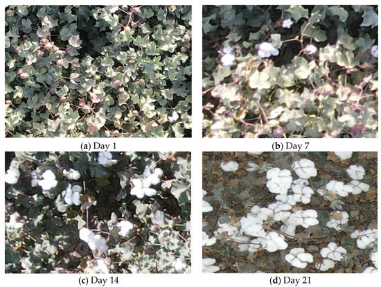 Cotton was one of the most important crops in the world. It is also an important industrial raw material and strategic material. It plays an important role in the economic development of China and the world [1]. As the early cotton harvesting mode occupied a large number of human resources, the production cost per unit area of cotton was relatively high, which restricted the market competitiveness [2]. In recent years, with the rapid development and promotion of mechanized harvesting technology of cotton, the advantages of large-scale, standardized, and mechanized production of machine-picked cotton are prominent, and the economic benefits are very significant [3]. Chemical defoliation and ripening are important links of mechanical cotton picking and an important measure to promote the maturity of late maturing cotton [4]. The defoliating and ripening effect of the cotton defoliant can not only promote the natural cracking of cotton bolls and concentrated boll opening but also effectively reduce the impurity content of mechanically harvested cotton, which directly affects the quality and efficiency of mechanically harvested cotton [5,6]. Therefore, timely detection of the use effect of cotton defoliants and providing data support for the subsequent harvest of machine-picked cotton are the most important. The main basis of detection is the cotton ball opening rate. The traditional manual detection method not only requires a large number of laborers but also the results largely depend on the subjective perception of inspectors, which makes timely detection of cotton inefficient. Therefore, it is very necessary to improve cotton detection technology [7]. In recent years, deep learning has become an increasingly popular method to solve problems in image classification, speech recognition, and video analysis [8]. Applications in the agricultural field include crop and organ classification, pest identification, fruit identification and counting, plant identification, plastic film cover identification, weed identification, and plant leaf analysis [9,10,11,12,13,14,15]. Most studies used convolutional neural networks, such as ResNet, VGG16, YOLO, and Faster R-CNN. Peng Mingxia et al., fused the feature pyramid network in the Faster R-CNN recognition algorithm to improve the image feature extraction ability of the algorithm and identify weeds in complex cotton fields; Yao Qing et al., adopted RetinaNet based on the resnext101 feature extraction network as the rice canopy pest detection algorithm and improved the recognition accuracy of the recognition algorithm by improving the feature extraction network in the network; Li Tianhua et al., Segmented the red area of Tomato by HSV method in the detection frame of YOLOv4 network and took the tomato whose segmentation area reached a certain proportion in the detection frame as the target output [16,17,18].