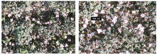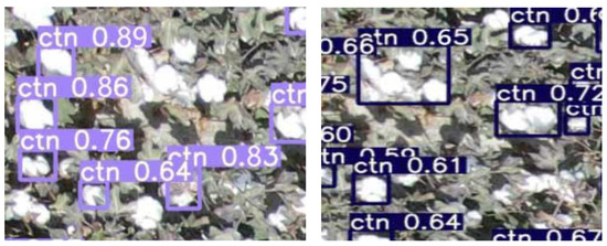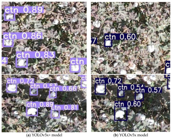 In order to visually verify the detection effect, the same data was selected for the two models for detection, and the detection results are shown in Figure 12. It can be seen that the accuracy of the YOLOv5x+ model detection was significantly higher than that of the original YOLOv5x model. The detection accuracy has been improved by more than 20%. It could more accurately identify small target cotton, reduce false detection and missed detection, and it improved the detection effect significantly.