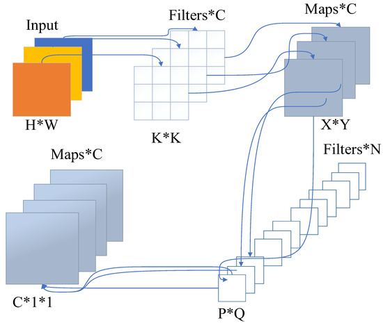 After embedding CBAM in the YOLOv5x algorithm, although the detection accuracy of the model is improved and the problems of missed detection and false detection are reduced, the parameter quantity of the model is also increased, and the detection speed of the model is reduced. In order to make the model have both high detection accuracy and fast detection speed, this study uses deep separable convolution (DWConv) to replace the ordinary convolution (Conv) operation in the YOLOv5x model. The principle of the deep separable convolutional neural network is shown in Figure 6.