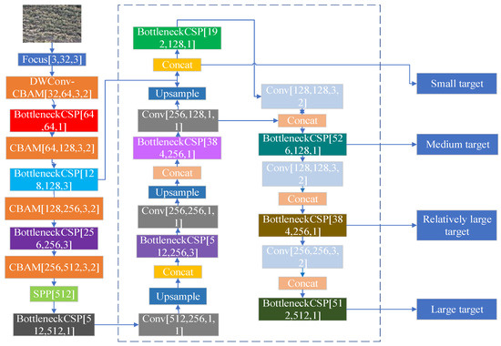 In the process of photographing cotton, due to the influence of flying height, the single area of cotton in the picture is too small. At the same time, it is also affected by problems such as cotton leaf color confusion and cotton leaf shading. In the YOLOv5x algorithm, the bottom feature map extracted by convolution kernel has a high resolution, clear color and texture, and accurate target position. However, with the deepening of the network, after multiple convolution operations, the semantic information of the extracted feature map is gradually enriched and contains more concept-level information, which is easier for a human to understand. However, the resolution of the picture is low, and the target position is rough. With the gradual deepening of the network, small-scale cotton targets may even be lost, resulting in missed detection and false detection.