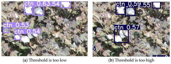 If the confidence threshold of the recognition model was not properly selected, the prediction results shown in Figure 9 would appear: when the confidence threshold was set too low, cotton leaves in the image would be identified by mistake, and when the threshold was set too high, cotton targets may be missed. Therefore, it was necessary to determine the appropriate confidence threshold for the model in combination with specific recognition tasks to accurately screen the cotton targets to be identified.