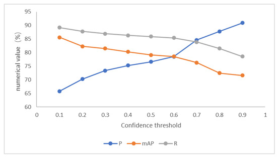 Based on the cotton recognition model obtained from the training, by adjusting the confidence threshold, the changes in the accuracy, recall, and mAP of the measurement model for cotton target recognition of the test set under different thresholds were compared, and the best prediction category threshold of the model in combination with the actual needs of cotton recognition tasks was determined. From this test, the identification accuracy, recall, and mAP distribution of the model under different confidence thresholds are shown in Figure 10.