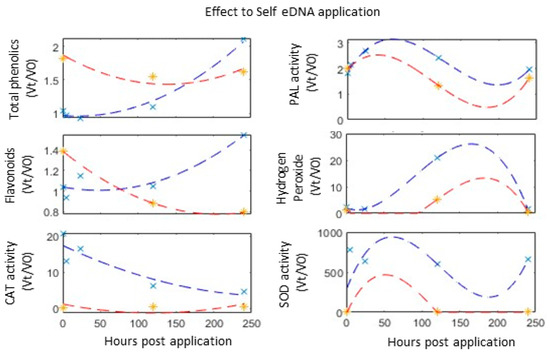Figure 3 show the responses of immunity markers in tomato plants treated with self eDNA at 50 ppm only at 45 days after transplant. As observed, all responses at the early stage (blue line) remained inactivated for this treatment, because no treatment was applied. In this case, results differed greatly from the early application of self eDNA. Activation of immunity markers was lower in adult plants; in fact, a statistical difference between controls and this treatment was only observed in the increment of HP and FLAV at 5 and 10 days post application and CAT activity at 10 DPA (Table 2).