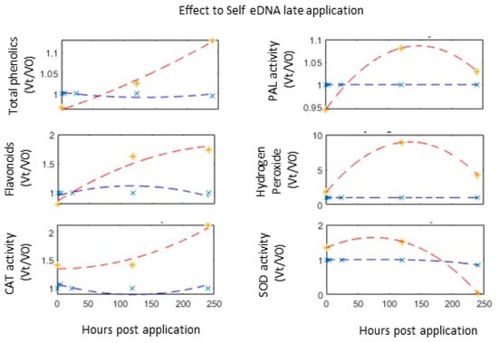 Mathematical Modeling of plant immune responses to self eDNA late application. Data showed in normalized dimensionless values for each sampling time in hours post-treatment application. Blue lines represent responses to first application and red lines represent responses to second application of treatment.