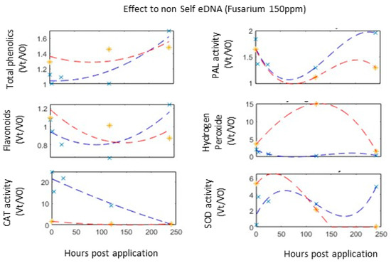 Mathematical modeling of plant immune responses to non-self eDNA (Fusarium eDNA at 150 ppm) applied in adult plants. Data showed in normalized dimensionless values for each sampling time in hours post treatment application. Blue lines represent responses to first application and red lines represent responses to second application of treatment.