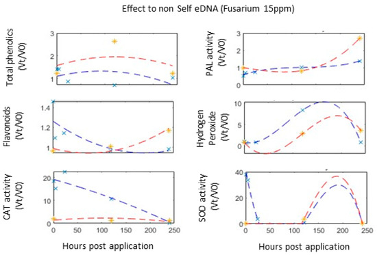 Mathematical modeling of plant immune responses to non self eDNA (Fusarium eDNA at 15 ppm) applied in adult plants. Data showed in normalized dimensionless values for each sampling time in hours post treatment application. Blue lines represent responses to first application and red lines represent responses to second application of treatment.
