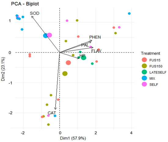 A principal component analysis (PCA) was made for all variable responses (Figure 7). The first two components obtained explained 80.97% of the maximal variance among all data. Analysis resulted in a slight differentiation of individuals by treatment. On the one hand, a group of individuals related to SOD activity conformed to mixed plants eDNA treatment at all evaluated times, except for the first and last sampling time. Another group related to CAT activity was conformed to mainly by Fusarium eDNA treated plants at both evaluated concentrations. Finally, there were some individuals partially grouped and related to PPP markers that included self eDNA, Fusarium eDNA and mixed eDNA treated plants (Figure 7).