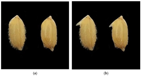 Criteria of seed germination. (a,b) Photographs of rice seeds showing the definition of germination (a) and no germination (b).
