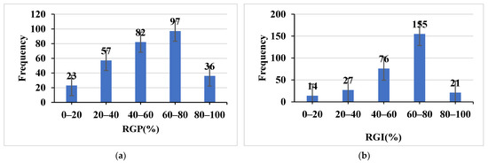 Frequency distribution of RGP (a) and RGI (b) among the 295 japonica rice accessions.