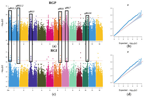 Manhattan plots and quantile–quantile (Q–Q) plots of GWAS for the salt tolerance. Red horizontal dashed line indicates the genome-wide significance threshold. (a) Manhattan plot for the RGP. (b) Q–Q plot for the RGP. (c) Manhattan plot for the RGI. (d) Q–Q plot for the RGI.