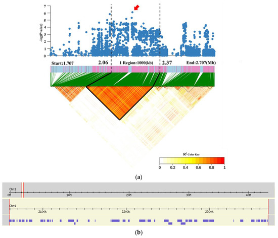 Candidate gene of qRG1.2 on chromosome 1. (a) Local Manhattan plot (top) and LD heatmap (bottom) surrounding the lead SNP. (b) Based on the Rice Annotation Project (RAP) [40], the 310 kb region contained 43 genes.