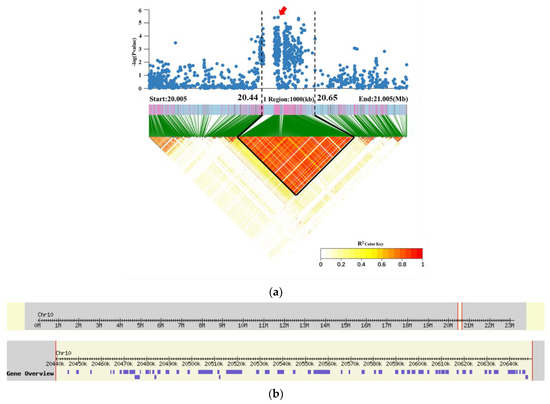 Candidate gene of qRG10 on chromosome 10. (a) Local Manhattan plot (top) and LD heatmap (bottom) surrounding the lead SNP. (b) Based on the Rice Annotation Project (RAP) [40], the 210 kb region contained 54 genes.