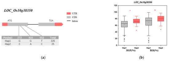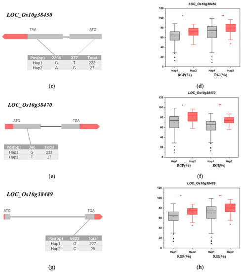 Gene structure and haplotype analysis. (a,b) represent the gene structure and haplotype analysis of LOC_Os10g38350. (c,d) represent the gene structure and haplotype analysis of LOC_Os10g38450. (e,f) represent the gene structure and haplotype analysis of LOC_Os10g38470. (g,h) represent the gene structure and haplotype analysis of LOC_Os10g38489. The * and ** suggest significance of ANOVA at p < 0.05 and p < 0.01, respectively.