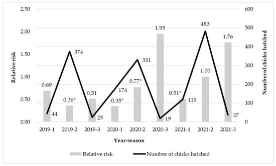 The effect of the year of the breeding period on the relative risk of total loss. The seasons are numbered: -1: spring, -2: summer, -3: autumn. * Statistically significant difference from the reference group (p ≤ 0.05).