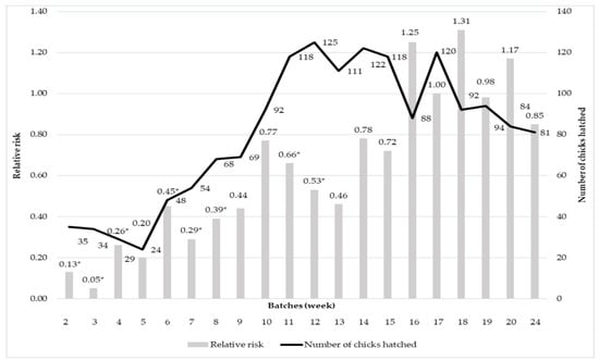 The effect of the mean hatchability of the batch on the relative risk of total loss. * Statistically significant difference from the reference group (p ≤ 0.05).