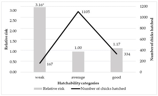 Figure 3 shows the effect of the different hatchability results of eggs on the relative risk of the total chick loss (being culled or die). Chicks from groups with weak hatchability (≤50%) had the highest relative risk of losses (Figure 3). However, the average hatchability was the most advantageous, resulting in not significantly but lower risk than good and a significantly lower risk than weak hatchability. This means that chicks hatched in a weak batch were more likely to be culled or die before the 48th week than the average and good hatching ones.
