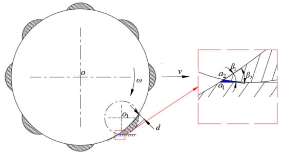 The Key Laboratory of Engineering Bionics of the Ministry of Education of Jilin University found that the bulge height d of the convex hull suitable for the press roller (diameter: 300 mm) is in the range 5–20 mm. Given that after the rotary tillage treatment of rice stubble fields the soil still has much agglomeration, the bulge height of the convex hull should be appropriately increased to improve the soil flow to a certain extent, and also to ensure the stability of the operation. Referring to the literature [] and pre-experiments, the height d of the convex hull is determined to be less than 14 mm and more than 8 mm. When a is 60, the corresponding height is 14 mm; in this paper, the other height is based on the bulge height in a reduction coefficient to zoom out. It can be seen from the literature [] that the corresponding sag of the press roller (300 mm in diameter) under the action of the load (300 N) is approximately 19 mm, and the β1 angle is 29°. At this time, the β2 angle corresponding to the convex hull is 29°, indicating that forming a vacuum zone is difficult, and the design meets the requirements of viscosity reduction.