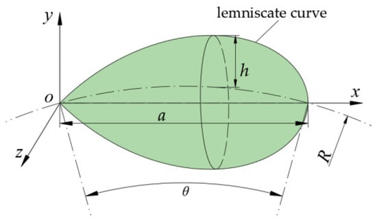 The spatial coordinate system o-xyz is established, and the curve of the effective section of the lemniscate curve rotates around the x axis to form a convex hull, whose outer contour is in the shape of a middle convex tip, as shown in Figure 3. The mathematical expression of the surface rotating about the x axis is as follows: