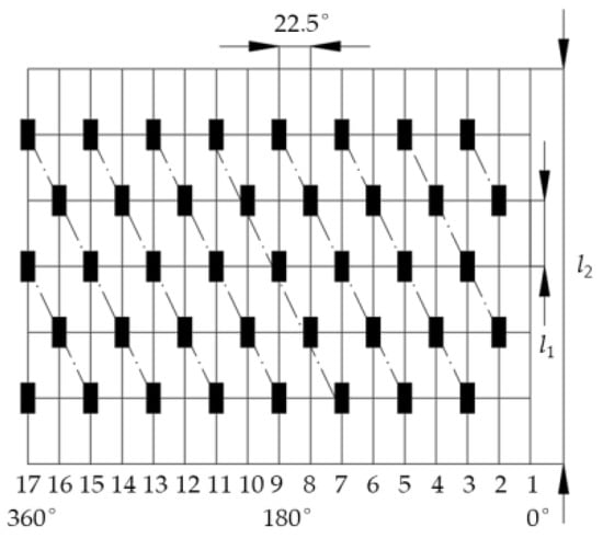 The arrangement of the convex geometrical structure can significantly influence the vibration and force of the press device. Thus, the horizontal and vertical balance should be achieved as far as possible when designing the convex geometrical structure arrangement. Referring to the literature [], a helical arrangement is used to ensure the balance of the axial force, and the radial angle is 22.5°, as shown in Figure 4. In this paper, the lateral width of the press roller is l2, and l2 is 220 mm. Beyond that, the axial distance of the adjacent two sets of convex geometrical structures is equal to l1, and the total number of convex geometrical structures is decided on the basis of l1, values for which are 30, 40, and 50 mm. When the press roller operates according to the arrangement of the press roller, two convex hulls only work simultaneously, which can reduce the fluctuation of working resistance, effectively decreasing the vibration and the force of the axle bearing when working under severe working conditions, and improving the service life of the machine, as shown in Figure 4. The process of constructing a non-smooth press roller for convex hulls and basal circles of different raised heights is shown in Figure 5.