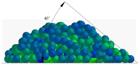 Selecting appropriate model parameters is an important step for the accurate prediction of forward resistance and soil adhesion. The basic model parameters were the Poisson ratio, shear modulus, and density, which were obtained through experiments and the literature. The contact mechanical parameters were static friction coefficient, dynamic friction coefficient, and surface energy, which needed to be calibrated. Using the virtual parameter calibration scheme, the regression equation of the particle contact parameters and the angle of repose was established. Based on the regression equation, the contact mechanical parameters were obtained (Table 1); the actual angle of repose is 40.8°. Using the data in Table 1, the corresponding virtual angle of repose is 40°, as shown in Figure 6, and the relative error of the actual value is 2%. The contact mechanical parameters were calibrated for an accurate simulation of the interactions between the press roller and the soil simulant.