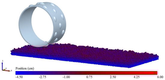 In order to control the simulation time and to improve the simulation accuracy, the irrelevant parts, such as bearings, side support plate, etc., were neglected [,,], and the simulation model was constructed according to the design scheme in the previous section, using SolidWorks 2018 software. After model building, the 3D solid modeling file was saved in igs. format and imported into EDEM 2020 software. The position of the press roller was adjusted to be above the positive direction of the soil. The surface of the soil was not in contact with the bottom of the press roller. The distance between the soil and the press roller was 10 mm (Figure 7). The shape of the soil particles was spherical; the size of the soil particles was 5 mm, and the number of particles was 18,000. The particle generation speed of the virtual dynamic factory was 8000 per second (Figure 7). The color represents the relative position along the z axis. Figure 7 shows that the height of the topsoil is uneven, which is almost consistent with the actual soil state after soil covering.