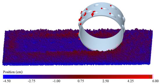 Figure 8 shows that there are particles adhering to the surface of the press roller; this phenomenon is close to the realistic situation, and indicates the reasonable selection of the contact model between the soil and the press roller. There are red particles behind the press roller, which fall off the surface of the press roller, showing that the parameters of the contact model are reasonable. Compared with the non-compacting area, the color of the soil particles in the compacting operation area is dark blue [], indicating that the soil particles in the operation area move downward along the z-axis, and the local color is darker blue, which indicates the convex hull operation area.
