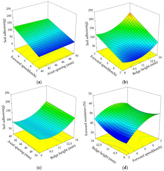 Figure 10 shows response surface of the significant interaction items in the Table 4 and Table 5. The approximately flat response surface in Figure 10a indicates there is a linear relationship between soil adhesion and the corresponding two factors. When the forward speed is large, the axial spacing increases without increasing the soil adhesion amount. When the forward speed is small, the soil adhesion decreases with the increase in the axial spacing. The influence of the forward speed on the soil adhesion is greater than that of the axial spacing. From Figure 10b, it can be seen that the influence of the bulge height on the soil adhesion is slightly greater than that of the forward speed, and the minimum value appears at the forward speed of 7 km/h and the bulge height of 45 mm. Figure 10c shows that when the bulge height is constant, when changing the axial spacing, the soil adhesion does not change significantly, which indicates that the axial spacing has little effect on the soil adhesion. When the bulge height is at a low level, the soil adhesion decreases with the increase in the bulge height. However, when the bulge height is at a high level, the soil adhesion decreases with the increase in the bulge height []. In Figure 10d shows when the forward speed is high, the response surface is relatively flat, whereas when the forward speed is low, the response surface drops sharply.